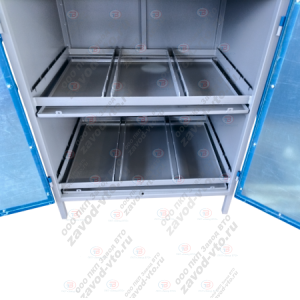 Для облегчения работы с тяжелыми аккумуляторными батареями полка и дно шкафа ШМА-05 выполнены в виде рольганга. Для предотвращения разлива электролита под полкой и дном шкафа установлены поддоны.